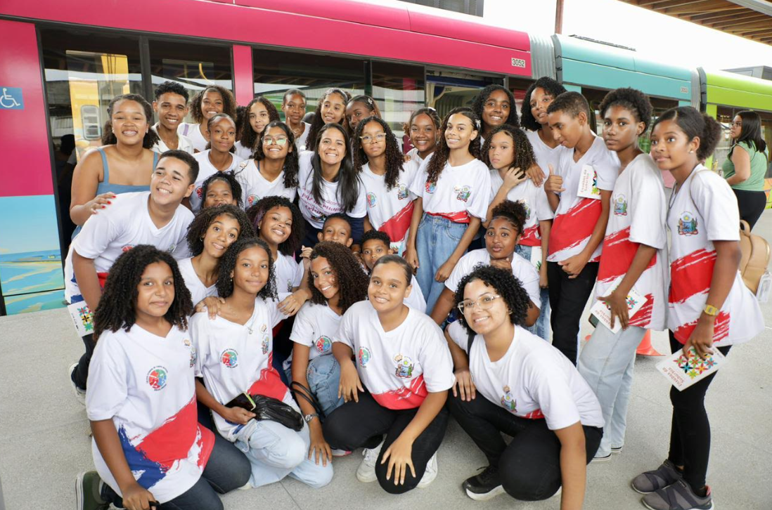 Estudantes da rede estadual vivenciaram, nesta terça-feira (31), uma experiência diferente de aprendizagem durante o “Circuito Educativo: VLT com alunos e alunas”, realizado em Salvador. A atividade reuniu 240 estudantes e 24 acompanhantes de cinco unidades escolares e proporcionou um primeiro contato com o Veículo Leve sobre Trilhos (VLT), novo modal que está sendo implantado na capital. O momento também foi marcado pela assinatura do Acordo de Cooperação entre a Secretaria da Educação do Estado (SEC) e a Companhia de Transportes do Estado da Bahia (CTB), para viabilizar o Edital Desafio Jovem Mobilidade.