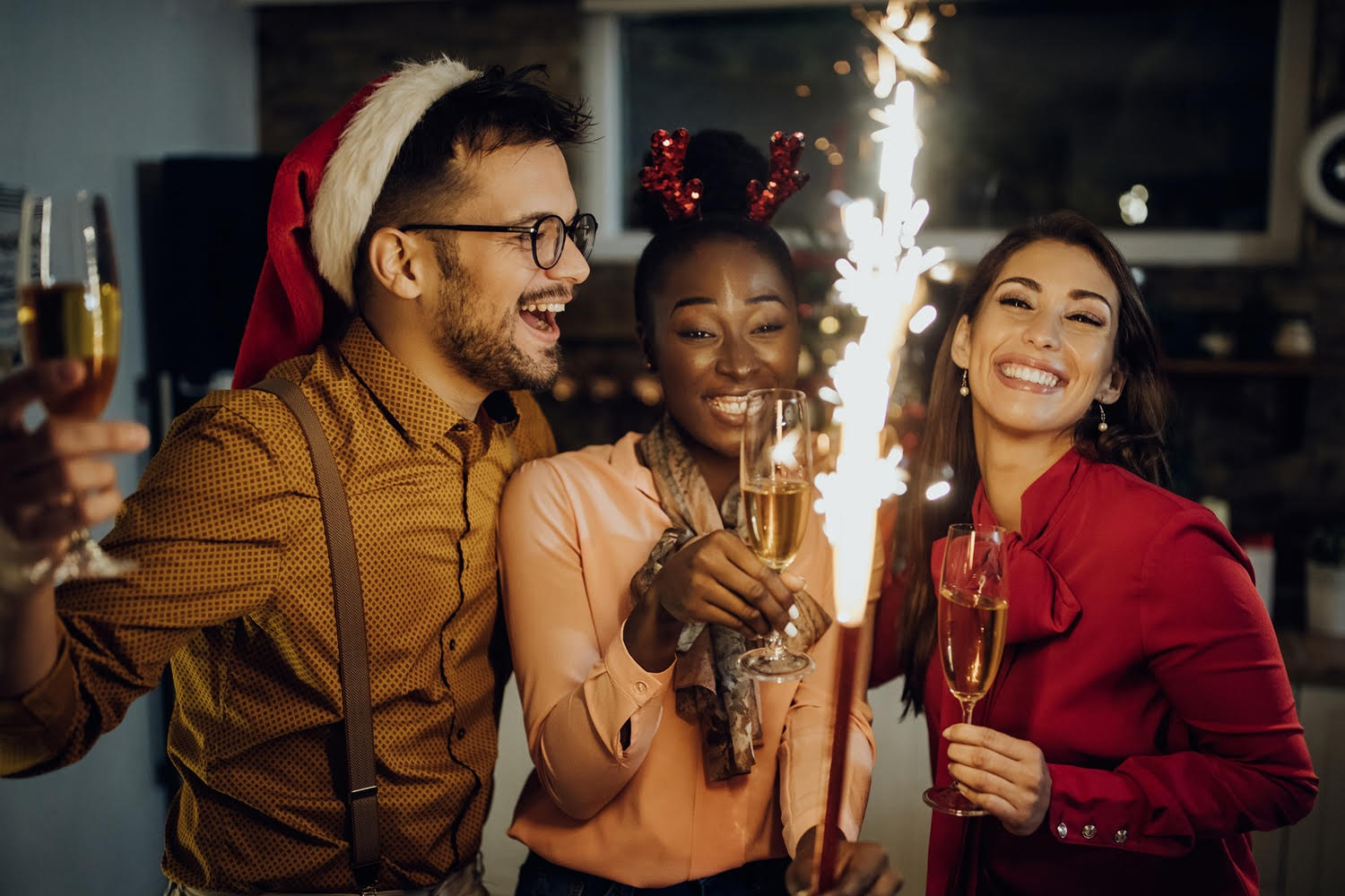Group of happy friends having fun while celebrating New Year together at home.