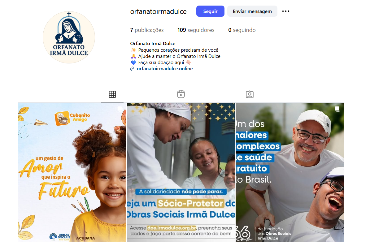 Todas as campanhas oficiais de doação das Obras Sociais Irmã Dulce são divulgadas por meio dos seguintes canais oficiais: