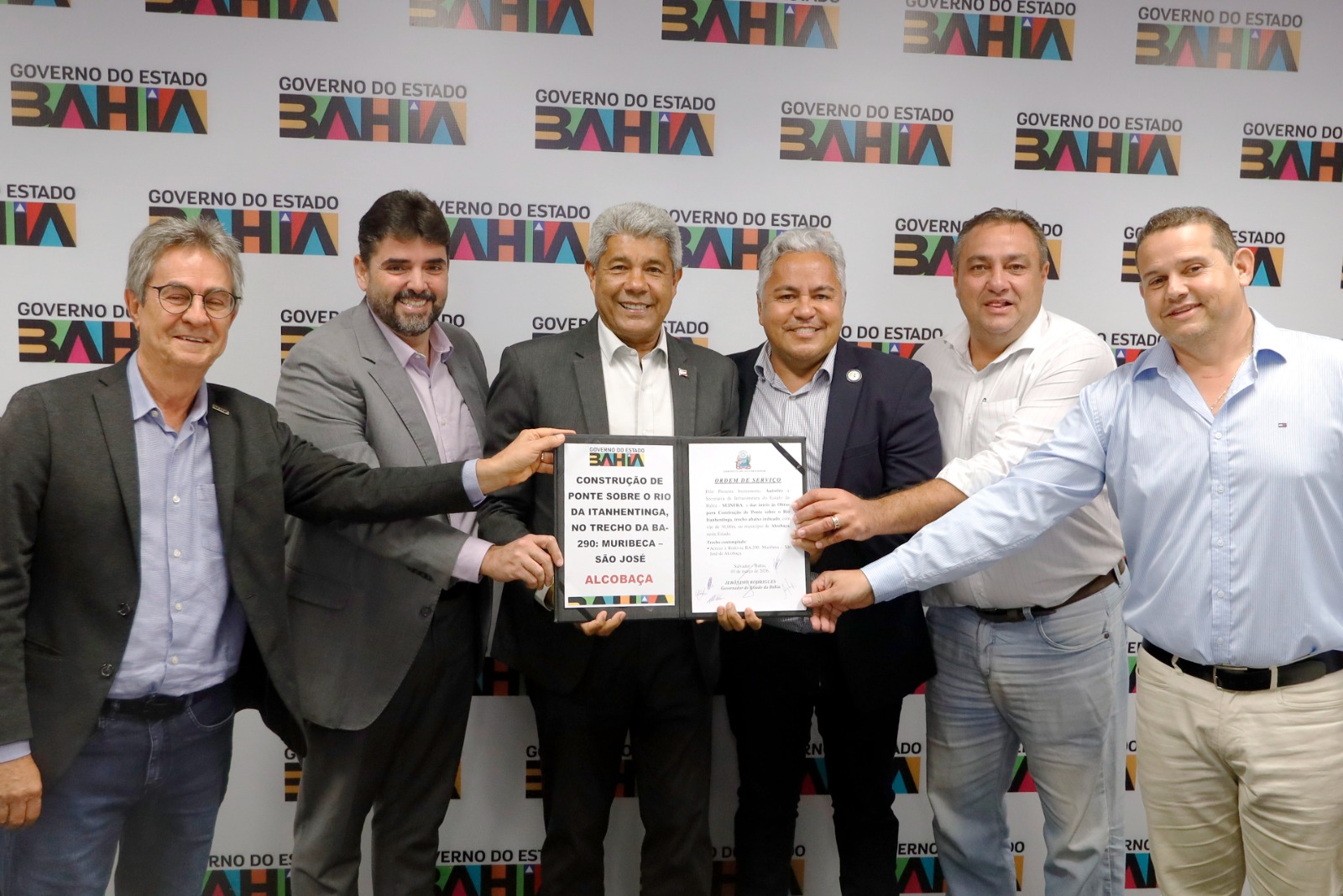 O governador Jerônimo Rodrigues se reuniu, nesta terça-feira (3), em Salvador, com o prefeito de Alcobaça, Zico de Baiato, para assinar a ordem de serviço para a construção de uma ponte sobre o Rio Itanhentinga, no trecho da BA-290 que liga as localidades de Muribeca e São José, no Extremo Sul da Bahia.