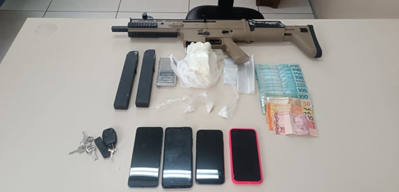 Questionado sobre a origem do material ilícito, o suspeito encaminhou os agentes para um endereço, onde foram apreendidos uma carabina calibre 30, dois carregadores, 428g de cocaína e três porções do entorpecente, um caderno de anotações, uma balança de precisão, R$ 1 mil reais em espécie, embalagens para o acondicionamento de drogas e três porções de maconha.