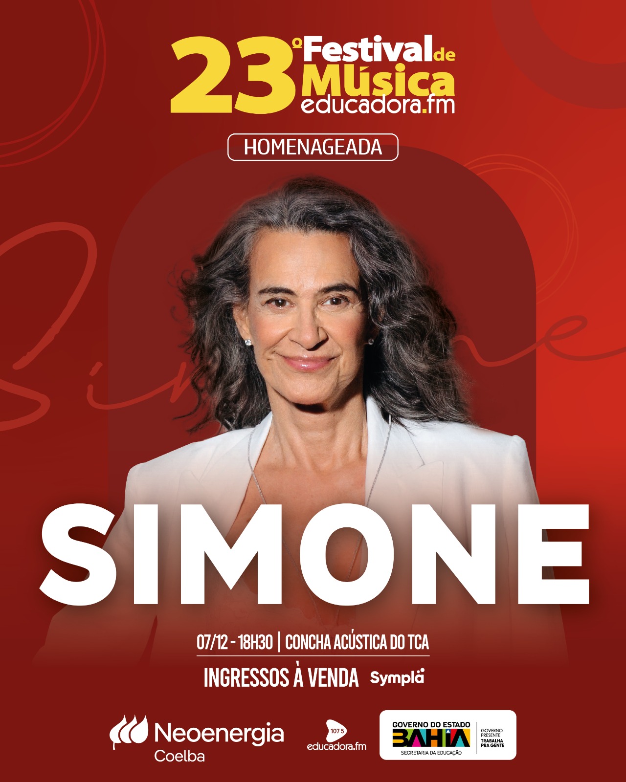 Reconhecida como uma das vozes mais importantes da Música Popular Brasileira, a cantora baiana Simone é a grande homenageada do 23º Festival de Música da Rádio Educadora FM. O show da cantora acontecerá no dia 7 de dezembro, na Concha Acústica do Teatro Castro Alves, em Salvador, durante a cerimônia de premiação do Festival de Música, com transmissão ao vivo na Rádio Educadora FM, TVE e redes sociais.
