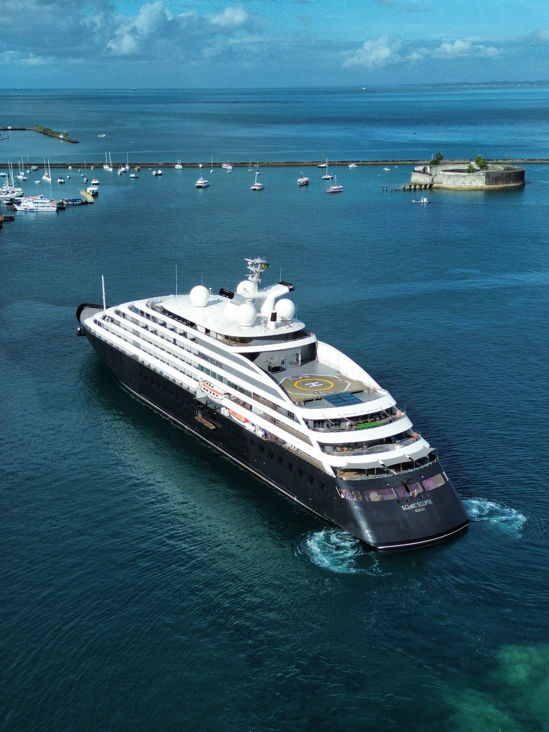 O luxuoso Scenic Eclipse atracou no Porto de Salvador, nesta quarta-feira (08), dando início à temporada de Cruzeiros 2025/2026. Vindo da Europa, o navio fez escala em Recife antes de aportar na capital baiana e segue viagem rumo ao arquipélago de Abrolhos. A Bahia é o estado do Nordeste que vai concentrar o maior número de escalas. Dados atualizados pela Autoridade Portuária Federal na Bahia – Codeba, responsável pela administração dos portos públicos, confirmam 80 escalas. Sendo 62 e Salvador e 18 em Ilhéus.