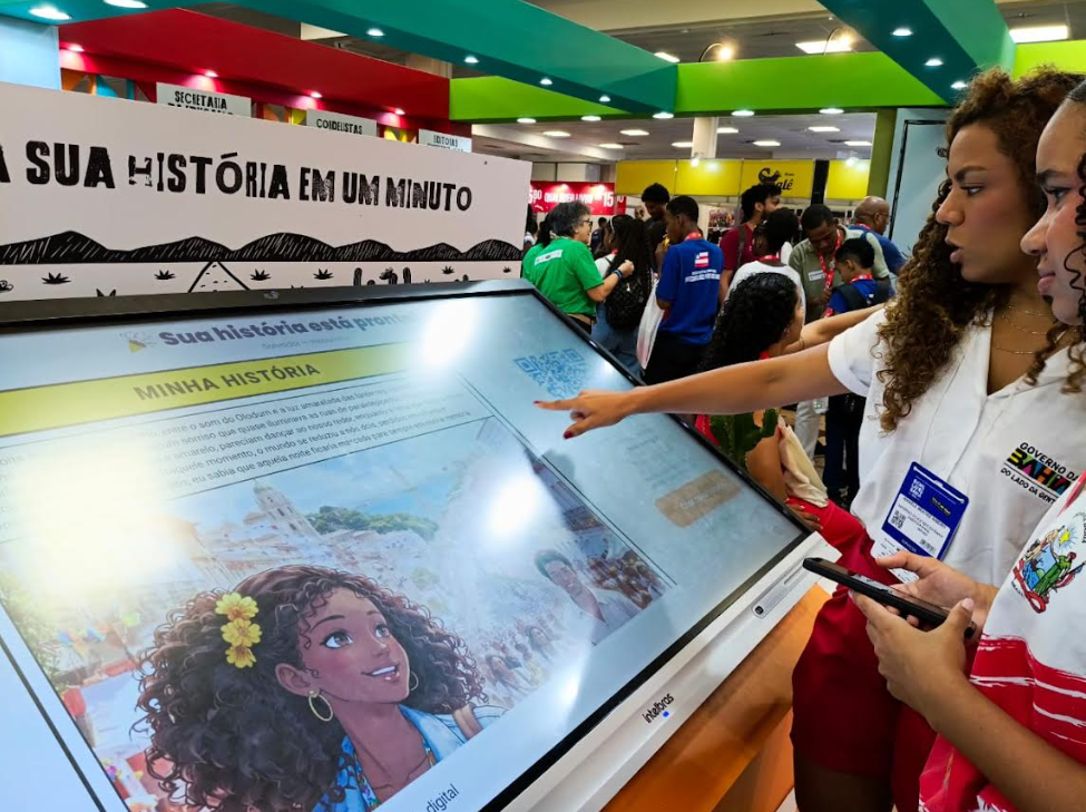 O totem interativo “Crie a sua história em um minuto” tem chamado a atenção de estudantes na Bienal do Livro da Bahia 2026. Instalado pela Secretaria da Educação do Estado (SEC) no estande do Governo do Estado, o recurso utiliza inteligência artificial para auxiliar na criação de narrativas, se tornando um dos pontos mais procurados do evento, que segue com forte presença da rede estadual.